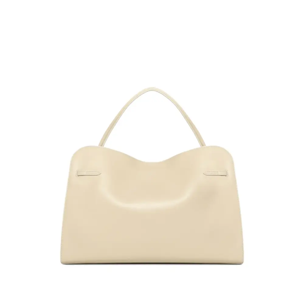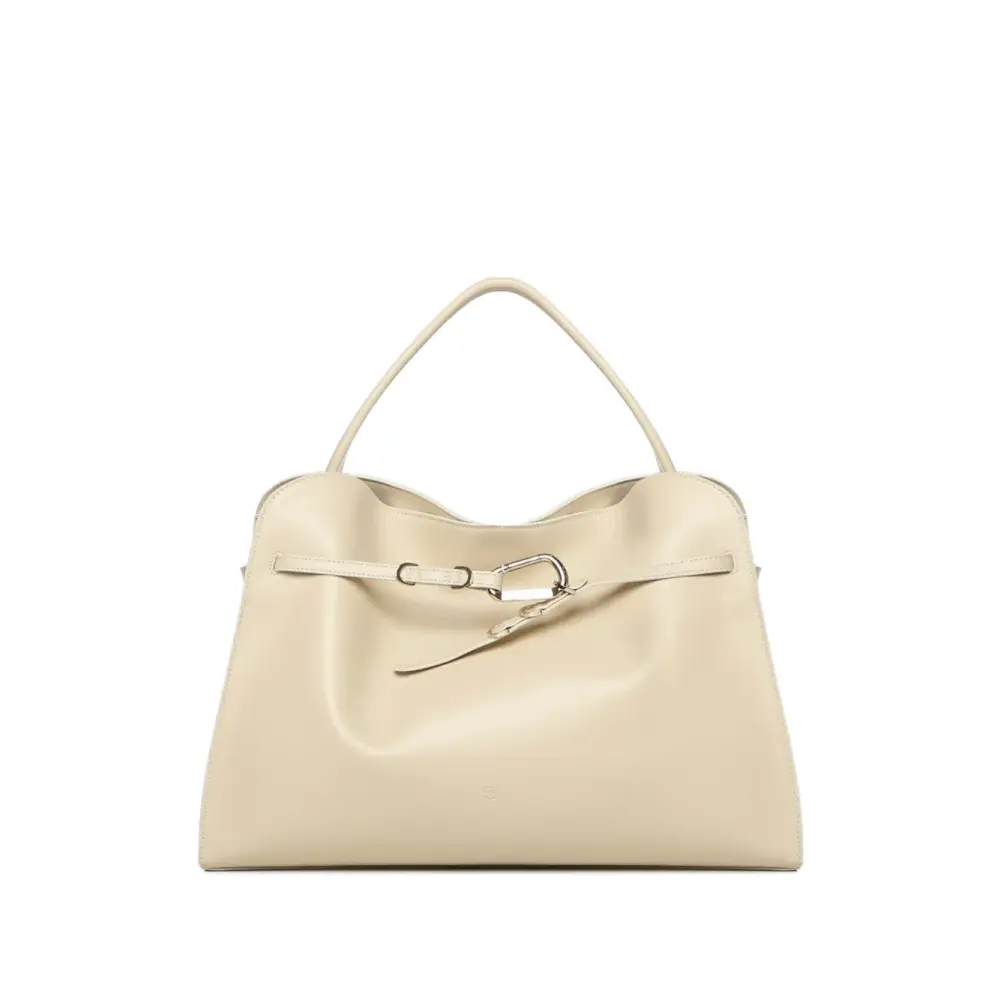 нейтральный бежевый цвет, телячья кожа, верхняя ручка, внутренний карман на молнии, украшение-пряжка