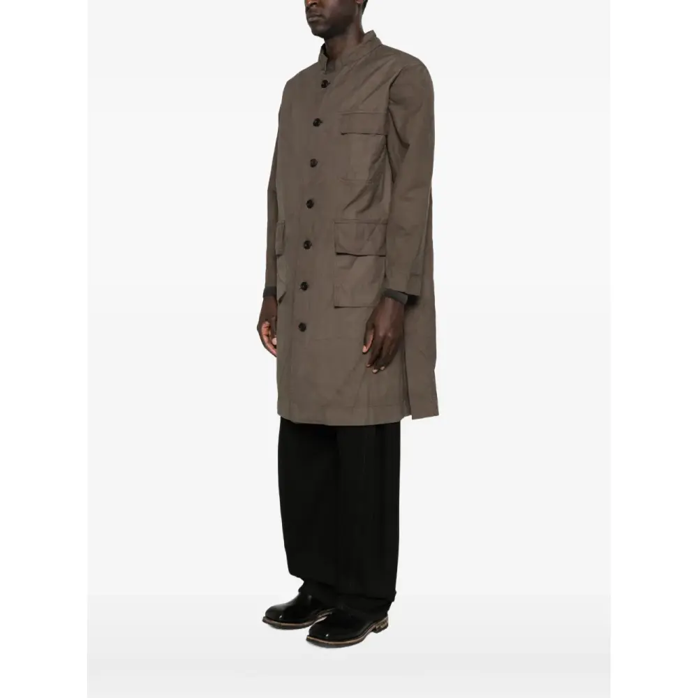 серый цвет, застежка на пуговицы, накладные карманы с клапанами, воротник-стойка, длинные рукава, прямой подол