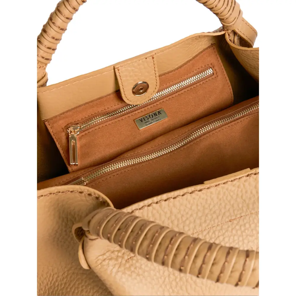 светло-бежевый цвет, две плетёные верхние ручки, фурнитура золотистого оттенка, скрытая магнитная застёжка, съемный плечевой ремень, основное отделение