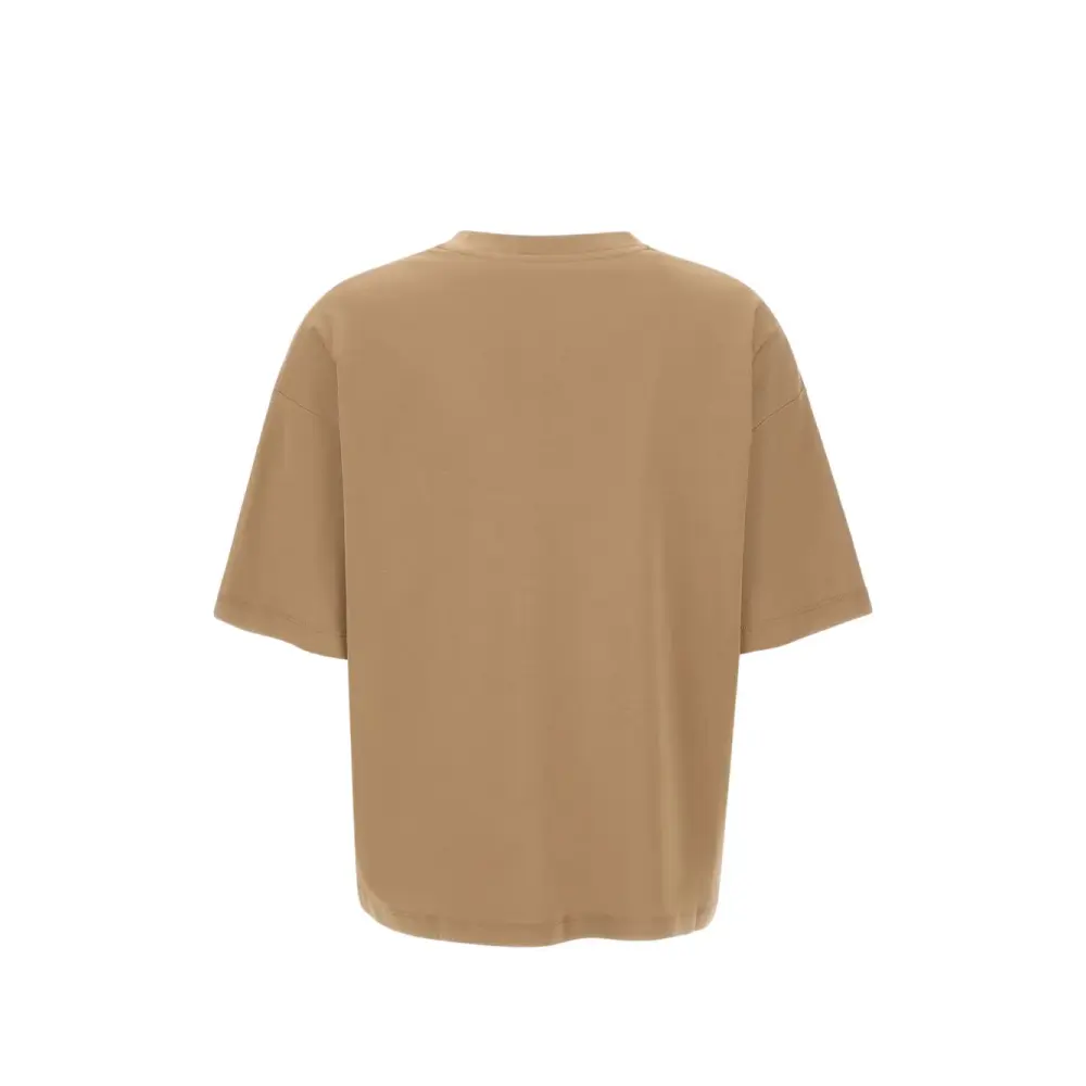 светло-коричневый свитер с округлым вырезом, заниженными плечами и разрезами по бокам
