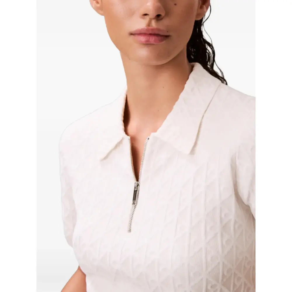Бежевая футболка-поло с текстурной отделкой, короткими рукавами, воротником и застежкой-молнией спереди.
