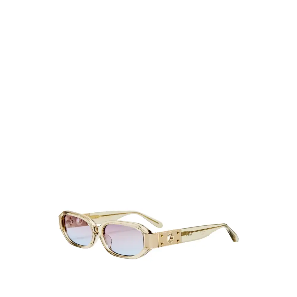 Бежевая оправа геометрической формы, тонированные линзы. В комплекте защитный футляр.