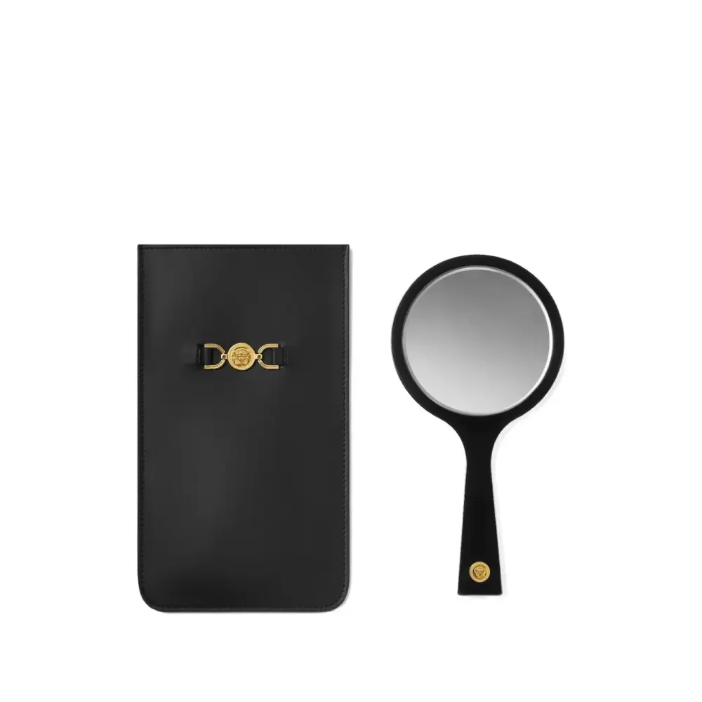 чёрный кожаный чехол с украшением в виде логотипа и фурнитурой золотистого оттенка
