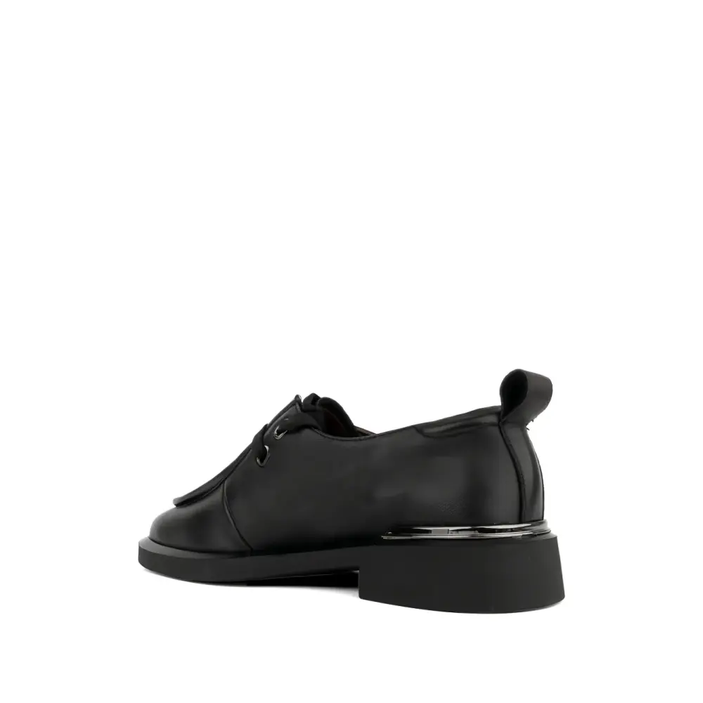 черная с металлической отделкой, петля на пятке, шнуровка спереди, круглый носок