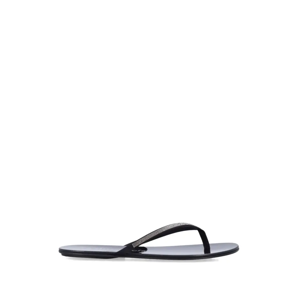 черные шлёпанцы с ремешком между пальцев, украшенные стразами, с открытым носком и плоской подошвой