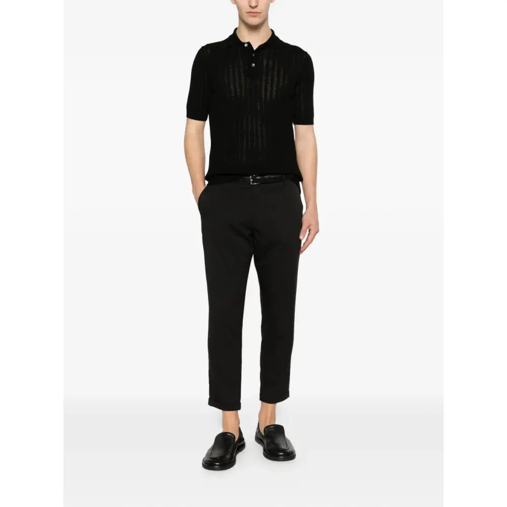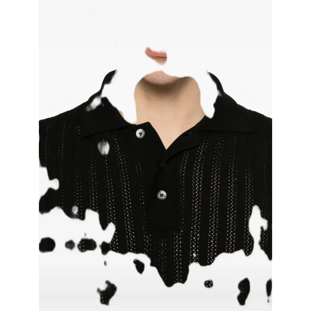 черная вязаная футболка с короткими рукавами, застежкой на пуговицы спереди, отложным воротником и ребристой вязкой
